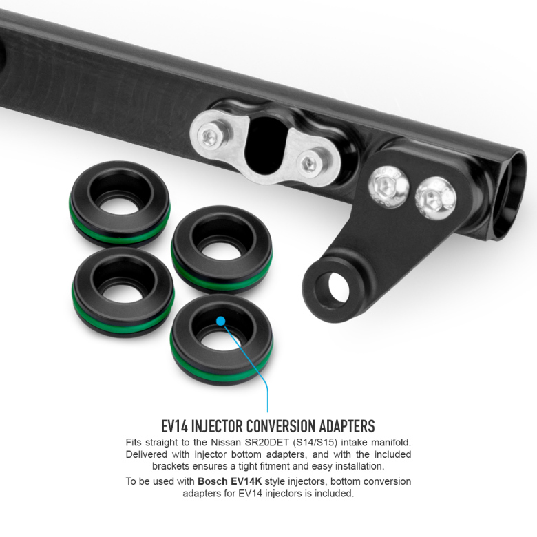 The Nissan 4-cylinder SR20DET (S14/S15) fuel rail is delivered with brackets for the Nissan SR20DET (only S14 and S15 versions) engines, allowing you to use AN fuel lines and aftermarket injectors for your classic Nissan engine found in the S14 and S15 chassis.