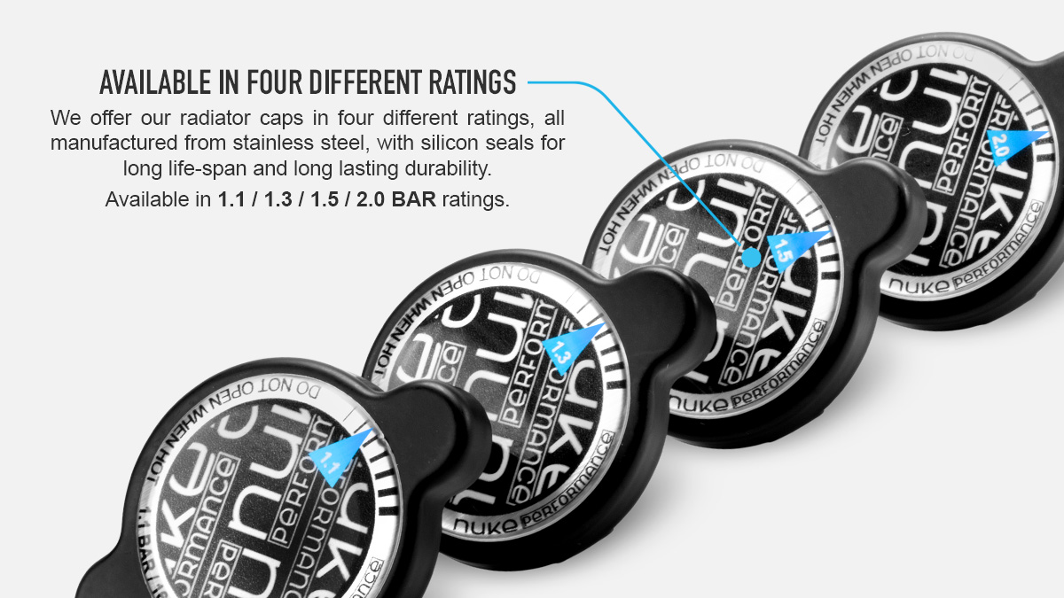 Nuke Performance radiator caps are developed for demanding applications where cooling system stability is critical. Available in 1.1, 1.3, 1.5, and 2.0 BAR, each cap is precision-calibrated to maintain consistent system pressure and increase the boling margin of your coolant.
